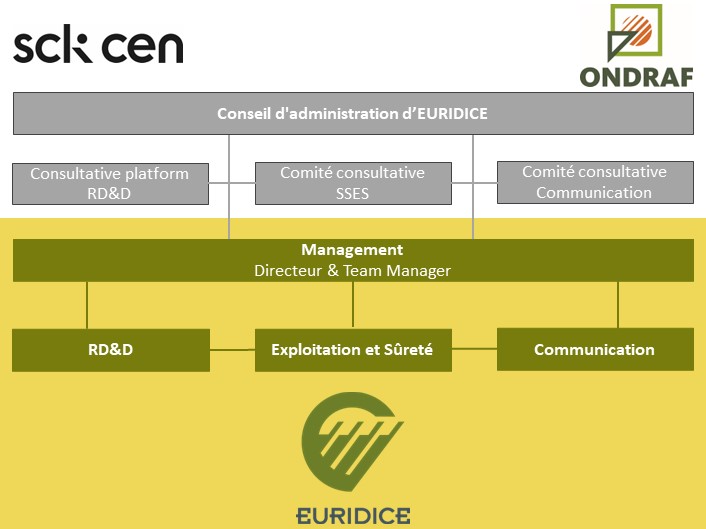 La gestion quotidienne est entre les mains du directeur. Le team manager soutient le directeur dans sa mission et le remplace en son absence. Le directeur et le team manager sont assistés pour les différentes activités d'EURIDICE par le coordinateur RD&D, le responsable Exploitation & Sûreté et le coordinateur Communication.