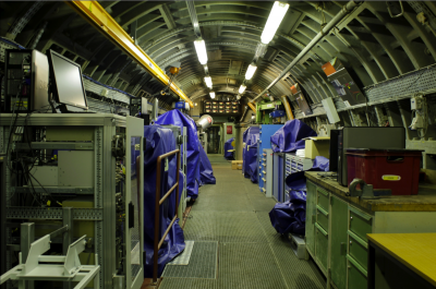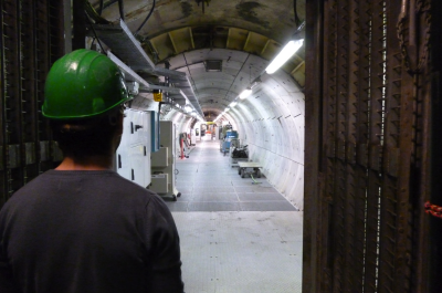 A mi-chemin dans la galerie principale, vous apercevez le point de jonction entre la partie neuve et la partie ancienne du laboratoire. Le bouclier du tunnelier s'y trouve encore.